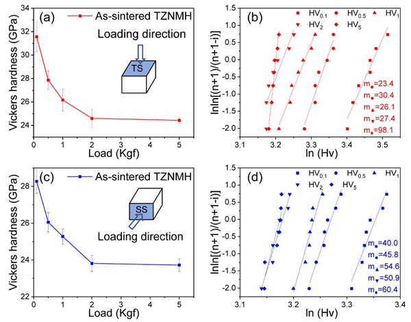 研究人员进一步采用放电等离子烧结合成了致密度为99.7%的高熵硼化物陶瓷。在0.98 N的载荷下,高熵陶瓷块体的维氏硬度达到了31.6 GPa。态密度计算表明,优异的力学性能是金属原子与硼原子之间强杂化的结果。同时,固溶强化机制和织构组织对硬度增强也具有积极的影响。在经过1800 热处理60 h后,高熵陶瓷保持单相六方结构,元素分布均匀,在0.98 N的载荷下,其硬度仍然超过30 GPa。该工作阐明了高熵硼化物陶瓷的设计原理和固溶机制,为高性能热防护材料提供了备选方案。