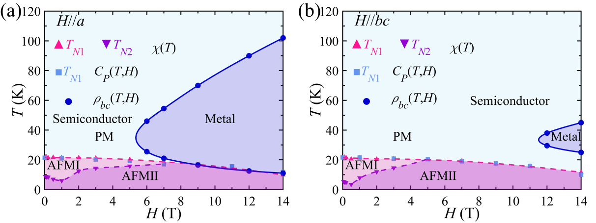 基于这些实验结果,研究团队绘制了该材料的电子相图,将材料的物性划分为反铁磁半导体、顺磁半导体和顺磁金属,这些属性表明该单晶的磁序与能带结构以及物性之间存在关联性。温度及磁场调变了磁矩的取向,改变了该EuMnSb2单晶的磁熵及能带结构,从而引起了磁性、比热及电输运等物性的变化。