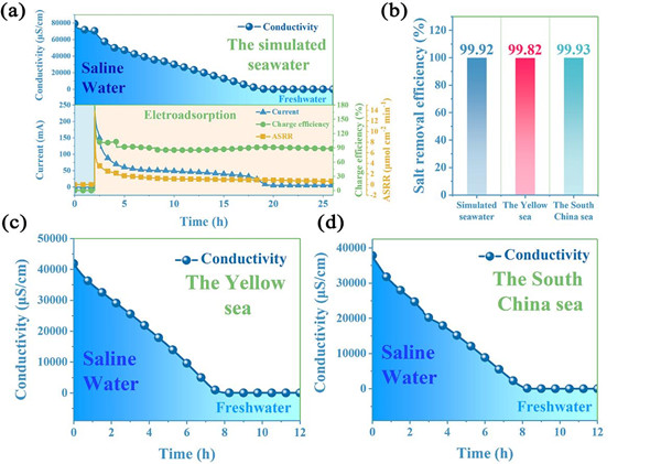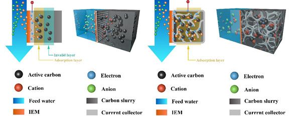 电容去离子技术 (Capacitive deionization, CDI) 作为一种新兴的海水淡化技术,相较于传统的反渗透和电渗析技术,拥有着得天独厚的优势,如高效的能源利用效率、相对较低的造价成本及对环境十分友好,近年来受到研究人员的广泛关注,并被作为未来实现碳达峰和碳中和目标的新型海水淡化候选技术之一。其中,流动电极电容去离子技术 (Flow electrode capacitive deionization, FCDI) 作为电容去离子技术的分支,利用活性炭水溶液在装置内形成双电层吸附盐离子的原理,凭借着伪无限吸附容量和较高的盐离子吸附速率,一度被认为是进行高效海水脱盐和资源富集浓缩的强有力技术。然而,目前的FCDI工艺仍存在电荷传输面积有限和电荷传输距离较大等问题,这削弱了集流体对活性炭水溶液的电荷传输能力,大大降低了FCDI装置的脱盐性能。因此,对集流体进行优化,进而扩大电荷传输面积和减小电荷传输距离,对提高FCDI脱盐性能和推动海水净化工业化进程至关重要。