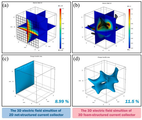 图2. (a) 传统二维平面装置电场模拟图;(b) 三维泡沫集流体电场模拟图;(c) 传统二维平面装置有效电场分布图;(d) 三维泡沫集流体有效电场分布图。