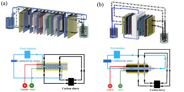 近年来,流动电极电容去离子技术 (Flow electrode capacitive deionization, FCDI) 因具有伪无限吸附能力和较快的盐离子吸附速率,被证明可以处理高盐度盐水甚至海水(35g/L),受到研究者的广泛关注。然而,实验室用FCDI装置普遍存在串流漏液情况,影响实验稳定性和装置脱盐性能,给实验性能验证和实验进度带来严重干扰。此外,传统的蛇形流道不利于碳浆料流动,导致其在急速拐角处流速较慢,直线处流速较快,这种流速不均匀的行为严重削弱了FCDI装置的脱盐性能。因此,在优化FCDI装置改进串流漏液问题的基础上,对碳浆料流道的进一步设计显得尤为重要。