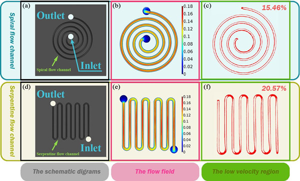 固体所研究人员提出一种新型FCDI装置,成功解决了串流漏液问题。新型FCDI装置采用包裹式结构,代替传统装置的堆叠组装形式,从根本上解决了漏液的风险。同时,新型FCDI装置采用盐水侧进侧出方式代替原有的流穿组件式,解决了串流的问题(图1)。基于此,实验人员对流道进行了优化设计,提出利用阿基米德螺旋模型减小拐角处与直线处的流速差异,提升装置的脱盐性能。CFD模拟计算和实验结果显示,阿基米德螺旋流道使得碳浆料的流速更加均匀,脱盐性能显著提升(图2)。新型FCDI装置在3.5g/L盐水的脱盐测试中表现出优异的脱盐性能,脱盐率达到99.88%,且具有实际应用性。该工作成功提升了FCDI装置的稳定性和脱盐性能,对后续流动电极电容去离子装置的发展和工业化推进具有重要意义。
