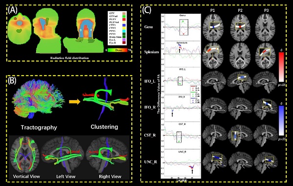 放疗是脑部肿瘤治疗的重要手段,在放疗规划中需重点考虑放疗效果与脑功能保护两个关键因素。为了达到最优的放疗质量,中科院合肥肿瘤医院从2017年起,联合放疗、影像、认知、临床专家,组成“放疗脑”联合研究团队,致力于精确放疗及迟发放射性脑损伤风险的早期评估和干预研究。项目启动以来,联合团队以鼻咽癌患者为主要研究对象,在放疗规划时,对关键脑神经核团-海马,进行充分保护,并在放疗前、放疗中及放疗后分别采集患者的MRI神经影像学数据和神经认知数据,实时跟踪放疗效果,评估放疗质量,以期建立迟发放射性脑损伤风险的早期预测模型,为最大化患者的治疗质量提供技术手段。2021年,在部分前期数据的基础上,团队采用基于纤维束的分析方法,探索了鼻咽癌患者大脑主要神经纤维束的放疗敏感性,为将来个性化放疗奠定了基础。