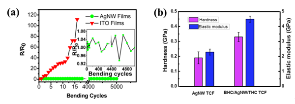 固体所柔性电子团队长期致力于包括力学稳定性、电学与热学稳定性等在内的纳米器件安全服役研究:为解决R2R生产中薄膜内银纳米线聚集引起电阻起伏带来的触控灵敏性下降、电学击穿问题,发明动态红外干燥技术克服浓度梯度相关的物质传输,生产的银纳米线薄膜均匀性优于ITO且在反复弯折中保持电阻稳定性(图1a);为满足反复触控时薄膜抗刮擦要求,调控柔性树脂与银纳米线界面状态来兼顾薄膜力学和电学性能,在满足折叠触控灵敏度前提下使表面硬度达到3H(图1b)。