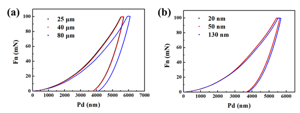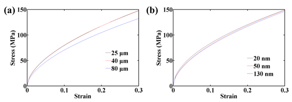 为了研究剪切应力下薄膜中银纳米线的断裂行为,研究团队制备了不同结构参数的银纳米线薄膜。通过自制剪切装置对薄膜进行剪切实验,并结合电镜图片统计得到断裂范围,以此作为薄膜抗剪切断裂能力的依据。通过纳米压痕实验得到载荷-位移曲线(图2),计算了不同纳米线直径和薄膜厚度银纳米线薄膜的硬度H、弹性模量E和H3/E2数值来表征材料的塑性性能。与实验同时进行的理论模拟,利用有限元方法模拟得到应力-应变曲线(图3),通过应力-应变曲线计算的屈服强度下限判断塑性性能,趋势与实验测试结果一致。结合薄膜中银纳米线的断裂范围,发现了薄膜的塑性性能与剪切断裂的关系,并通过深入的显微结构分析(图4),进一步揭示了这一关系,即采用不同直径的纳米线及薄膜厚度来进行力传递,应力集中区缺陷的形核与运动带来的塑性变形会造成纳米线“颈缩”差异,银纳米线薄膜的塑性越好,抗剪切断裂能力越强。为此,在银纳米线与衬底之间加入超薄金属缓冲层来分散应力集中,能在不影响光学指标前提下提高薄膜抗剪切断裂能力,而且可以增加薄膜的挠曲稳定性。该工作为银纳米线薄膜的大规模工业应用提供了新思路。