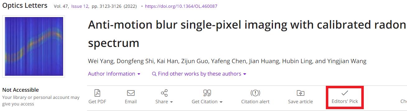 该项研究成果先后申请发明专利三项,论文发表在新一期Optics Letters上,并被选为Editor's Pick文章(注:论文被选入Edito’s Picks意味着相关工作具有极高科研价值并在相关领域极具代表性。)。论文审稿专家1指出”...该工作证明了单像素相机也能拍摄出快速运动物体的视频,在该领域具有应用前景...”;论文审稿专家2指出”...实验结果显示该工作极具前景...”,审稿专家充分肯定了本项工作在单像素成像领域展现出的应用前景。