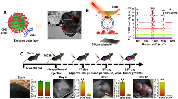 为了检测PD-L1,研究人员首先制备了具有SERS活性的Au/TiO2/Fe3O4(壳/芯)磁性纳米复合材料,同时又制备了Ag/4-ATP/Au(壳/芯)SERS纳米标签。然后,科研人员用特定的适配体(aptamer)修饰这些纳米粒子,从而可以特异性地捕获循环外泌体PD-L1,形成三明治夹层式的SERS探针,通过分析拉曼报告信号,可以定量分析PD-L1生物标志物。该方法非常灵敏,可检测低至4.31ag/mL的PD-L1。进一步研究表明,在小鼠模型中,科研人员可以通过分析肿瘤中 PD-L1随时间变化的表达水平,进而分析小鼠肿瘤发展情况。
