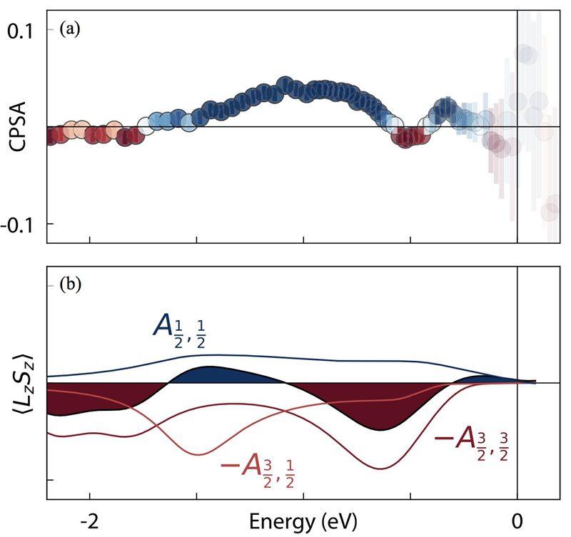鉴于此,该研究团队结合目前最先进的圆极化自旋角分辨光电子发射谱(circularly polarized spin-ARPES, CPS-ARPES)和多体理论计算,详尽地研究了Sr2IrO4的低能电子结构。基于j=1/2态的自旋-轨道耦合期望值<L●S>为正而j=3/2态的<L●S>为负这一特征,研究人员通过测量<L●S>在布里渊区不同k点随能量的变化,清楚地展现了Sr2IrO4中的低能物理对赝自旋1/2模型的偏离。如图1所示,在Γ和Z点,在某些能量区域Sr2IrO4的电子态均表现出以j=3/2态为主导的特征(<L●S>为负)。通过详尽的LDA+DMFT计算,研究人员发现只有包括所有t2g态才能定量地解释实验结果(如图2所示)。最终研究人员确定了Sr2IrO4的低能谱权重:在0到-1.64 eV的能量范围内,j=3/2态占74%的份额,这和赝自旋1/2模型有很大的偏离。