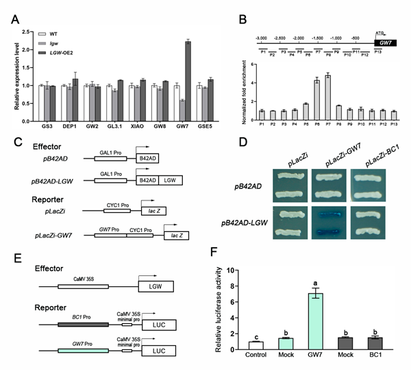 水稻产量是最重要的性状之一,籽粒大小是调控产量性状的关键因子。科研团队利用离子束诱变获得的一个水稻小粒突变体lgw,基因克隆表明lgw是脆秆基因BC12的新等位变异。BC12通过调控细胞壁纤维素合成产生脆秆性状,但是如何参与水稻籽粒大小的调控目前还未报道。研究发现lgw突变位点位于BC12的核定位信号区段,影响其核定位。过表达该基因可显著增加粒长和千粒重。LGW/BC12通过直接结合粒长基因GW7的启动子并调控其转录,从而影响籽粒大小。LGW/BC12—GW7作用途径的发现为细胞壁合成与产量形成机制解析奠定基础。