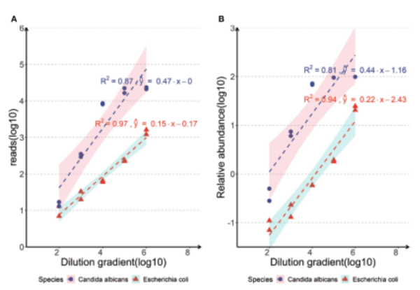 图2:纳米孔扩增测序法检测体液中大肠埃希菌和白色念珠菌的检出限分析