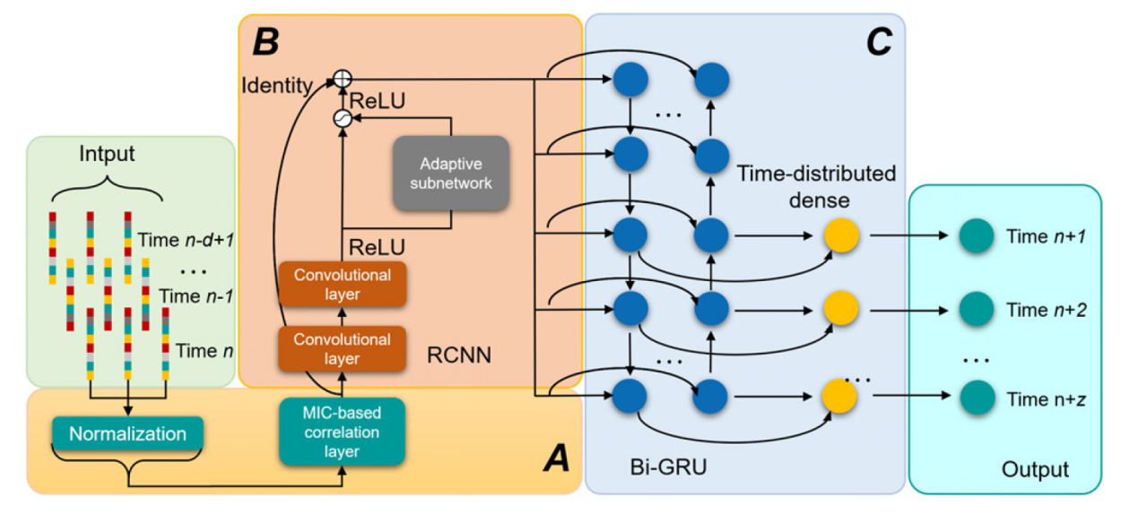 为解决该问题,核能安全所和香港城市大学研究人员提出一种端到端的混合深度网络架构。该架构包含三个重要模块:基于最大信息系数的参数变量选择模块,可实现对输入监测过程数据的特征选择功能;具有自适应软阈值结构的卷积残差消除模块,可实现噪声抑制功能;分布式连接的双向门控单元预测模块,可实现趋势预测功能。该架构能有效降低不同程度和不同类型噪声导致的不确定性,同时有助于利用相邻节点之间同类型监测数据中的冗余信息提高预测性能。