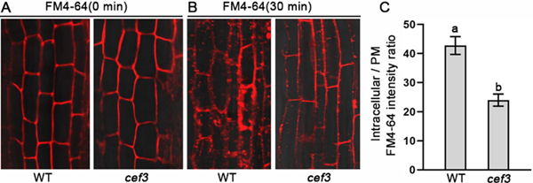 科研团队长期关注利用离子束诱变挖掘细胞壁组分突变基因并开展秸秆的综合利用研究。在对离子束诱变获得的水稻脆秆突变体cef3 进行图位克隆发现:CEF3 基因编码一个参与囊泡运输的蛋白,调控次生细胞壁纤维素合成酶催化亚基基因CESA4/7/9 的表达以及蛋白的运输,影响纤维素合成酶复合体在细胞膜上的定位,从而最终影响次生细胞壁纤维素的合成。酶解糖化效率是决定秸秆木质纤维降解的重要参数,纤维素是生物质的主要成分,纤维素的含量以及其高度结晶化和聚合化是生物质酶解糖化的关键限制因素,与野生型相比,CEF3 基因的突变使得秸秆的酶解糖化效率提高52%,因此CEF3 基因在秸秆生物质能源利用方面具有良好的前景。