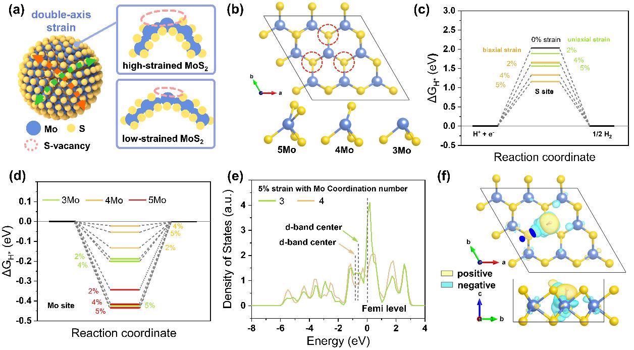 鉴于此,固体所研究人员提出了一种新型自硫化策略来诱导原位形成层数可调的双轴应变MoS2纳米壳,并深入研究了双轴应力和层数如何影响其局部电子构型和活性中心结构。电化学测试和密度泛函理论(DFT)计算表明: 1)可以优化MoS2纳米壳中的应变程度、层数和Mo配位条件以实现增强的析氢反应(HER) 活性;2)双轴应变和S空位有助于促进氢吸附步骤;3)具有4个配位数的特定Mo位点的双层 MoS2纳米壳表现出高效的理论催化活性。这项工作为制备具有微调层数的双轴应变TMDs电极以及如何提高电催化性能开辟了一条新的有效途径。