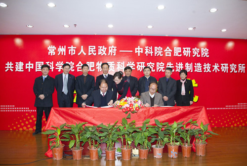 2010年1月9日上午11:00,中科院合肥物质科学研究院与江苏省常州市人民政府共建“中国科学院合肥物质科学研究院先进制造技术研究所”签约仪式在常州科教会堂举行。合肥研究院院长王英俭和常州市副市长王成斌在会上签约,中科院院地合作局、合肥研究院、南京分院、江苏省科技厅、中共常州市市委、常州市人民政府、常州市科技局、常州市科教城等单位的领导参加了签约仪式。
