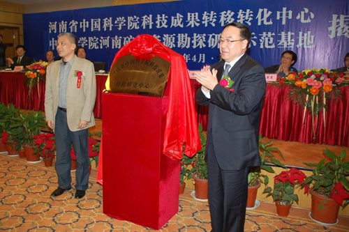 4月19日,河南省中国科学院科技成果转移转化中心和中国科学院河南矿产资源勘探研究示范基地挂牌仪式同时在郑州举行。中科院院士、国家自然科学基金委员会主任、党组书记陈宜瑜、中科院副院长丁仲礼和河南省副省长徐济超等出席揭牌仪式并为中心和基地揭牌。河南省中科院成果转移转化中心和示范基地的成立,标志着中国科学院与河南省的合作进入了新的历史时期。