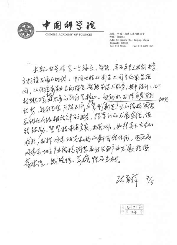 “未来的世界将是一个绿色、智能,并为更多人类共创共享,可持续发展的时代。中国也将从制造大国走向制造强国,从传统制造业走向绿色、智能制造与服务。其中设计、ICT材料与工艺、全球服务的创新是核心。智能所发挥自身的学科优势,解放思想,开拓创新与江苏常州地方制造产业的结构调整和优化升级相结合并为之服务,探索新的发展途径,值得鼓励。望坚持求真务实,扎实工作,取得实实在在的成就,发挥国家研究机构的骨干引领作用,为国家和地方产业结构调整和新兴产业发展提供基础性、战略性、前瞻性的贡献。”