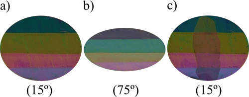 (a, b) 有图案的复合薄膜随观察角度不同颜色的变化;(c)水浸入后颜色变化