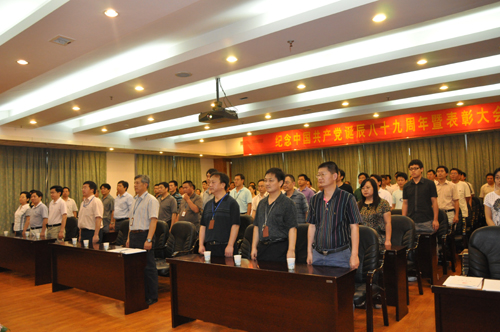 在建党89周年之际,等离子体所新老党员欢聚一堂纪念党的生日,会议开始,全体党员起立,奏响国歌。随后举行了新党员宣誓、老党员重温入党誓词仪式。