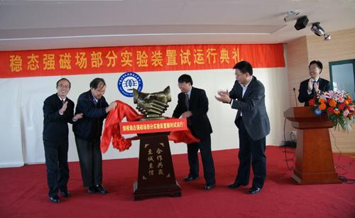 甘子钊、刘鸣华、许武、王英俭为稳态强磁场部分装置试运行揭牌