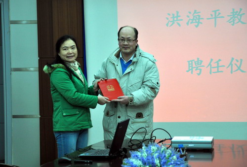 固体所副所长曾雉向洪海平教授颁发“特聘研究员”聘书
