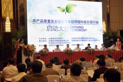 2011年5月13日,“安徽省农产品质量安全追溯与农超对接科技示范行动” 启动大会在合肥召开,安徽省副省长倪发科、副秘书长余焰炉、合肥研究院院长王英俭共同启动水晶球,开通了农产品质量安全追溯平台,这标志安徽省农产品质量安全追溯与农超对接科技示范行动正式全面启动。中科院合肥物质科学研究院作为本次科技示范行动的发起单位之一,利用多年承担国家重点工程和大科学工程建设任务时在传感器技术、大型分布式测控系统、计算机技术、自动化技术以及数据库等方面的成果积累,重点承担了农业物联网传感接口标准化模块设计、开发平台、测试平台与安徽省农业物联网数据中心建设任务。