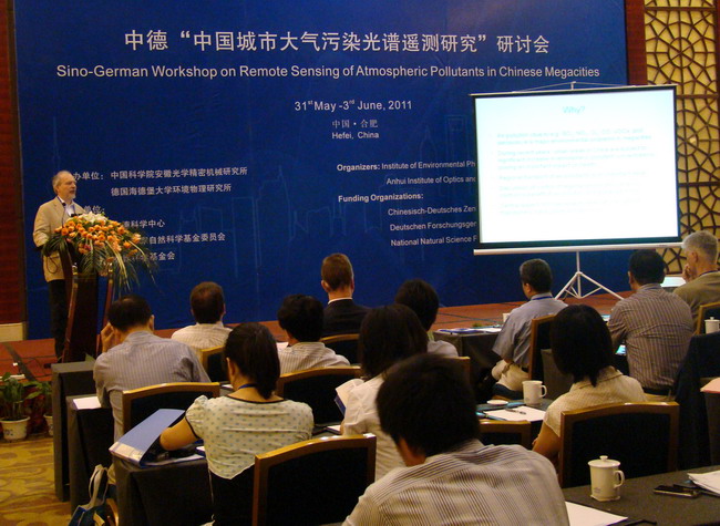 由中德科学中心资助、中国科学院安徽光机所与德国海德堡大学联合主办的“中国城市大气污染光谱遥测研究”研讨会于2011年5月31日-6月3日在合肥召开。中科院安徽光机所所长刘文清研究员和德国海德堡大学环境物理研究所所长Ulrich Platt教授共同担任本次会议主席并致辞。中德科学中心德方副主任赵妙根教授出席本次会议,详细介绍了中德科学中心的情况。
