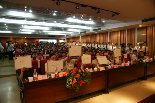 耳熟能详的经典曲目在各代表队的精心演绎下,给人以全新的感受,令人振奋。如研究生部的多声部合唱“保卫黄河”唱出了荡气回肠的英雄气概,获得了观众和评委的一致好评;固体所一曲“四渡赤水出奇兵”收放自如、抑扬顿挫,赢得全场一阵阵掌声;智能所“那一片红”用手中的党旗和铿锵有力的歌声,给人以强烈的视觉冲击力和感染力;风尘仆仆远道而来的常州先进制造所的陕北民歌“山丹丹开花红艳艳”带给大家美的享受;在强磁场中心的演出阵容中,还出现了一位老外的身影,他是来自美国的科技顾问、中科院特聘研究员布鲁斯博士,尽管他不会说中文,靠着在曲谱上标注的拼音,他和中国同事一起和谐地唱出了“社会主义好”和“歌唱祖国”的主旋律;老同志们的歌声凝聚着深情,年轻人的演唱充满活力,每首歌都各有特色,每个队都有自己的亮点,与其说是一场歌唱比赛不如说是大家向党倾诉心声、讴歌时代、赞美祖国的一种真情表达。