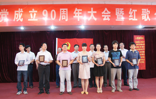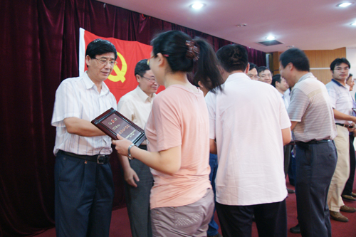 会上,王英俭宣读了党委《关于表彰先进党支部和优秀共产党员的决定》。在欢快的音乐和热烈的掌声中,党委委员们为12个先进党支部和40名优秀共产党员颁发了奖牌并合影留念。