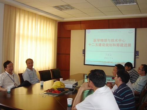 李建刚副院长先是听取了中心筹备组组长王宏志对筹备期工作进展的汇报,后又与中心的筹备人员进行沟通、座谈,他指出,医学物理与技术中心属于研究院新建的科研单元、十二五重点培育的学科方向之一,从筹备开始就要有明确的发展定位,要根据“开放联合、优势互补、协同创新、合作共赢”的原则,通过多种形式和渠道加强与省内、国内知名的医疗机构开展全面战略合作,发挥各自的优势,共同为推进“健康中国2020”战略实施和战略目标的实现做出我们的贡献。他认为,中心要抓住当前乃至今后一段时间涉及国民健康的重大需求,发挥自身优势、集中主要力量、发挥学科交叉与协作、实行逐个突破,在肿瘤、代谢性疾病等重大慢性、非传染性疾病的预防控制、检测、治疗与康复方面有所突破。