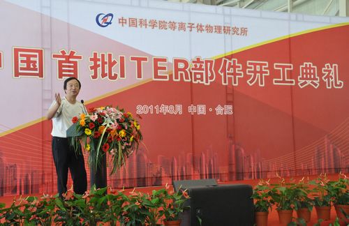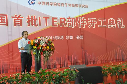 中国国际核聚变能源计划执行中心副主任罗德隆,合肥研究院院长王英俭,等离子体所所长李建刚、党委书记张晓东等出席典礼,等离子体所副所长吴新潮主持开工典礼。在开工典礼上,罗德隆对中国首批ITER部件开工表示祝贺,他介绍了国际热核聚变实验堆(ITER)计划,表示中国要通过参加ITER计划,以10%的投入享受100%的知识产权,促进我国在核聚变领域水平整体提升。他最后表示,参加ITER计划各项工作是一项光荣而艰巨的任务,并对此提出了具体要求。王英俭、李建刚代表首批ITER部件承担单位表示,要严格按照国际标准,按时提供合格部件。