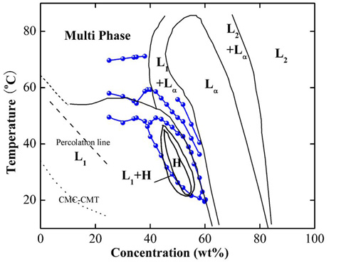 力学谱实验得到的Pluronic L64水溶液的温度-浓度相图(蓝色符号)。其中,L1、L2、Lα和H分别表示各项同性的胶团溶液相、反胶团相、层状液晶相以及六角凝胶相。