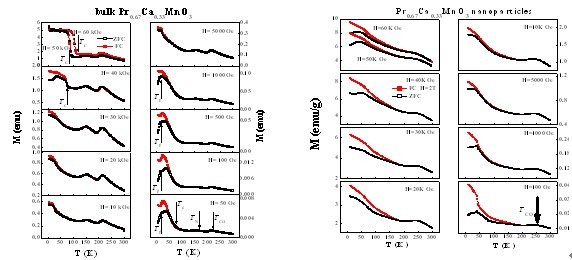块体和纳米颗粒的Pr0.67Ca0.33MnO3在不同磁场下的磁化强度随温度的变化关系