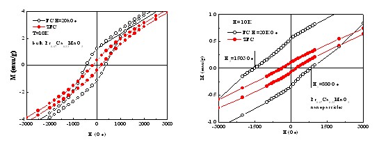 块体和纳米颗粒的Pr0.67Ca0.33MnO3的M-H曲线