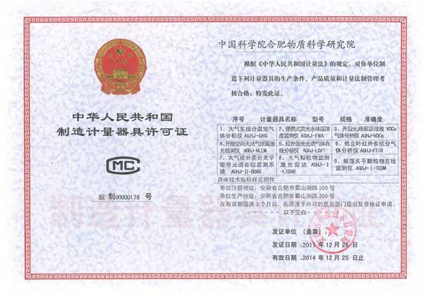 近日,合肥研究院安光所环境光学中心研制的“大气多组分温室气体分析仪”、“便携式荧光水体藻浓度监测仪”、“开放光路面源排放VOCs气体分析仪”、“开放空间天然气泄漏激光检测仪”、“红外激光光谱气体在线分析仪”、“傅立叶红外多组分气体分析仪”、“大气成分差分光学吸收光谱在线监测系统”、“大气颗粒物监测激光雷达”、“振荡天平颗粒物在线监测仪”等九项计量器具获得安徽省质量技术监督局颁发的《中华人民共和国制造计量器具许可证》。