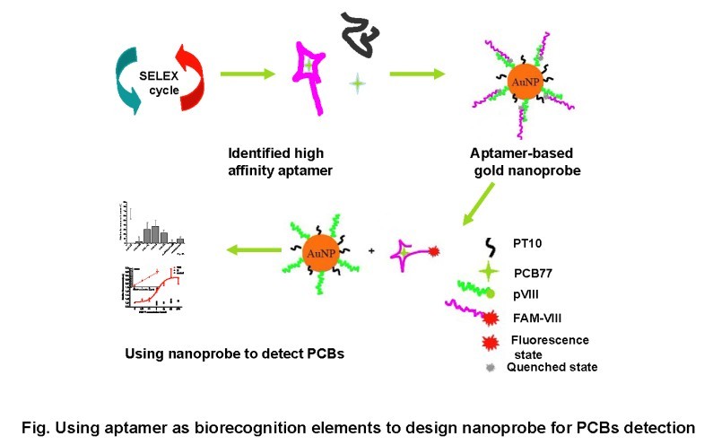 在国家纳米专项子课题“纳米材料表面生化修饰与POPs的选择性富集”的支持下,辐射与环境毒理研究室开展了新型生物纳米传感器对PCB的快速分析检测研究。他们利用SELEX技术,筛选得到了特异性针对PCB的适体,并在此基础上,发展了生物分子快速修饰纳米材料的新方法,构建了基于适体的金纳米颗粒传感器(图),其PCB77最低检测浓度达0.5µg/L。上述方法操作方便,耗时短,具有较好的识别特异性和灵敏度,为发展快速痕量生物纳米检测方法奠定了一定的基础。下一步,他们将进一步开展复杂体系中痕量PCB的快速检测工作。