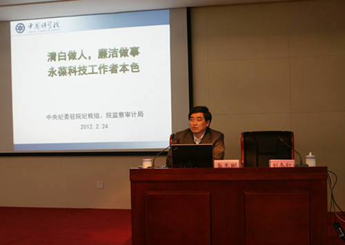 为贯彻落实院党组关于加强中科院反腐倡廉建设的部署和要求,进一步加强对科研和管理骨干的宣传教育,2月24日下午,中央纪委驻院纪检组、院监察审计局在合肥研究院召开了中国科学院反腐倡廉宣传教育视频会议。中央纪委驻院纪检组组长、院党组成员李志刚出席会议,并作了题为“清白做人,廉洁做事,永葆科技工作者本色”的报告。