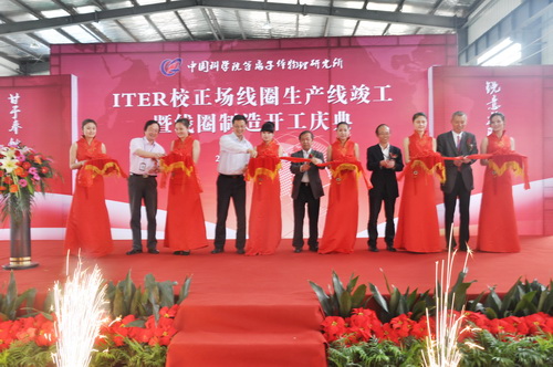 4月28日,在刚完成设备安装和生产线建设ITER 校正场线圈生产车间,等离子体所隆重举行国际热核聚变实验堆计划(ITER)校正场线圈生产线竣工暨线圈制造开工典礼。