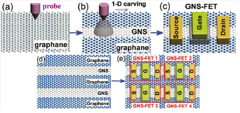 自从2004年石墨烯(单原子层石墨)被发现以来,科学界和工业界对其在光学器件、电子器件、生物技术以及高分子复合材料方面的应用前景一直非常看好。石墨烯晶体管则是这些应用中很重要的角色之一,目前广泛采用石墨烯纳米带来实现场效应管的功能。然而,在等离子刻蚀的实验制备过程中,石墨烯纳米带的边缘往往因为高能等离子的轰击而变得非常不平整,而且石墨烯纳米带边缘的悬挂键化学活性非常高,外来基团在边缘的吸附很难控制和预测,另外,与衬底的相互作用也会带来许多的负面影响。因此,用石墨烯纳米带来实现石墨烯晶体管的实际应用还有许多困难需要克服。