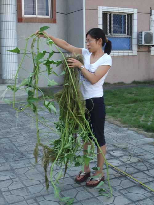 近年来,冯慧云博士与安徽雷克环保公司开展合作,研究蕹菜改良与富营养化水体相互作用,培养出生长快速且可在水下生长的喜磷株系。据测,单株茎杆长达5米,茎杆2.5米处茎粗1.8厘米,总重1.6kg,含总氮5.12g、总磷1.98g,且该株系根系非常发达,平均根长50厘米,粗如豆芽,重为586g,占总重量的35.1%,四处伸长的根系十分有利于吸收水中营养物质,其吸纳氮、磷的能力分别可达3.2g/kg和1.2g/kg(鲜重)。