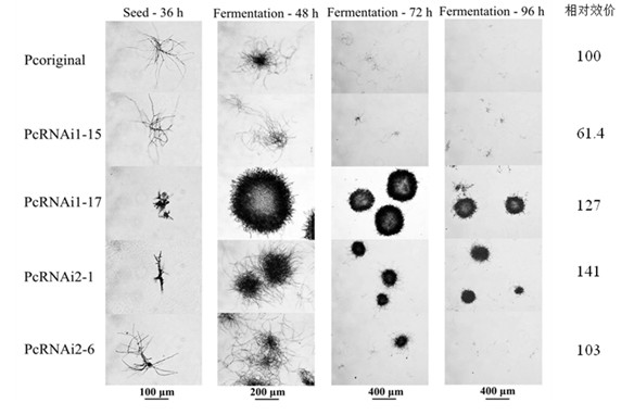 放大发酵发现,大多数突变株菌丝生长较原始菌短小,膨胀、分支数增加,进入发酵后期,菌丝发生缠绕形成菌丝团甚至菌丝球。在一定范围内,青霉素产量与菌丝团紧密度呈正相关,与chs4表达量呈负相关,其中,干扰突变株PcRNAi2-1青霉素产量比原始菌提高41%。研究人员由此推断,chs4基因沉默影响了产黄青霉形态,使菌丝体发生短小、膨胀、分支增加等变化,而此种形态更有利于菌丝聚集成菌球,进一步降低了发酵液粘度,有利于物质传递,提高青霉素产量。
