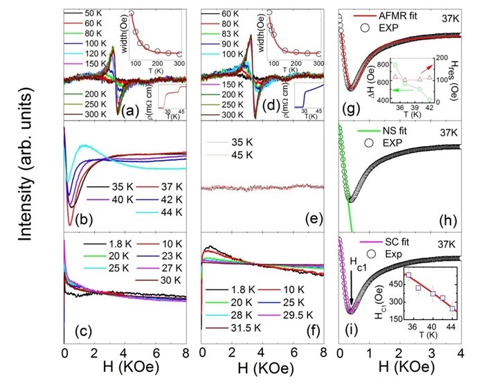 具有44 K超导相的ESR谱(左),30 K超导相的ESR谱(中)及使用不同模型对的拟合(右)