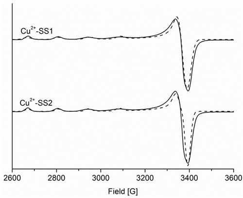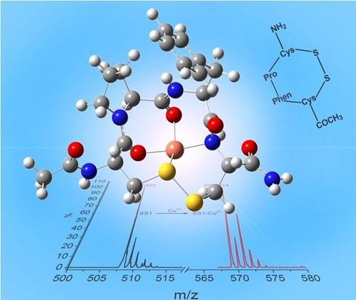 张立云副研究员设计、合成了基于蛋白质金属离子结合保守基序CxxC 的两种环肽SS1和SS2,并利用质谱、傅里叶变换红外和电子顺磁共振技术等研究了环肽与二价铜离子的结合与配位化学。研究人员借助电子顺磁共振技术揭示了该体系中二价铜离子的变形四边形结构,该配位属于典型的II型铜结构。相关研究结果为发展基于环肽的金属离子生物传感器,监测和分析环境中重金属离子提供了基础和重要数据。