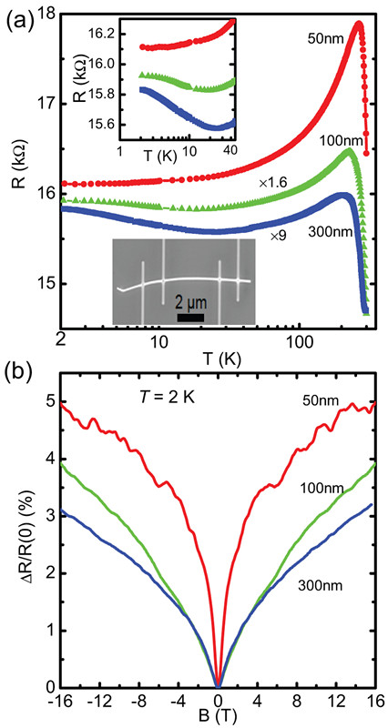 图1:不同直径Bi2Te3纳米线电阻随温度和磁场的变化