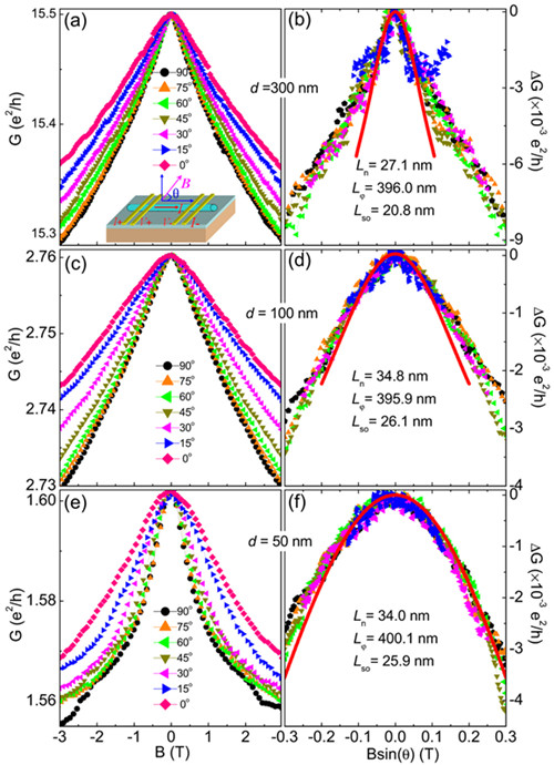 图2(a)(c)(e)不同直径Bi2Te3纳米线磁电导随磁场角度的变化;(b)(d)(f)不同直径纳米线低场表面电导在不同角度垂直分量的归一化行为。红色实线为一维反弱局域化理论模型拟合曲线。