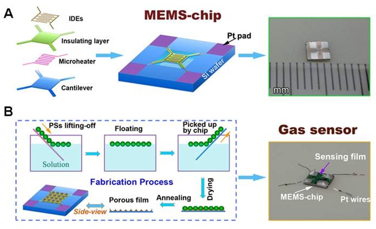 图1:基于MEMS技术的微型基板结构示意图(A)与有机胶体模板溶液浸渍-无损转移的薄膜器件构建策略(B)。右侧为对应的实物照片。