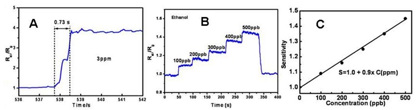 图3:图2所示的器件对乙醇的气敏测量结果(工作温度:350oC)。(A):3ppm时的响应曲线(响应时间小于1秒);(B)对不同浓度(100 ppb~500ppb)乙醇的气敏响应曲线(连续测量);(C):灵敏度与乙醇气氛浓度关系。