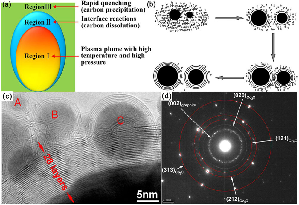 最近,固体所科研人员基于液相激光熔蚀(Laser ablation in liquids, LAL)技术,成功获得了洋葱层状碳包覆的Co3C/OLC纳米粒子。相对于无定形的壳层碳,洋葱层状的碳结晶性更好,具有更好的热学和化学稳定性,以及优异的电传导性和催化活性等。