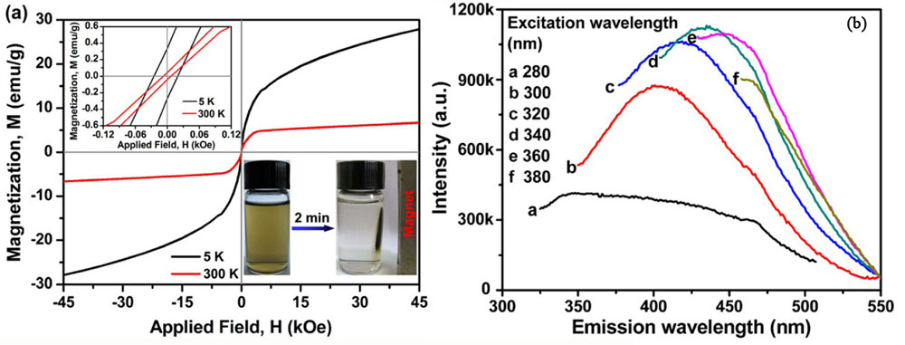 图2. Co3C/OLC核壳纳米粒子的(a)磁化曲线(M-H);(b)激发光依赖的荧光发射光谱