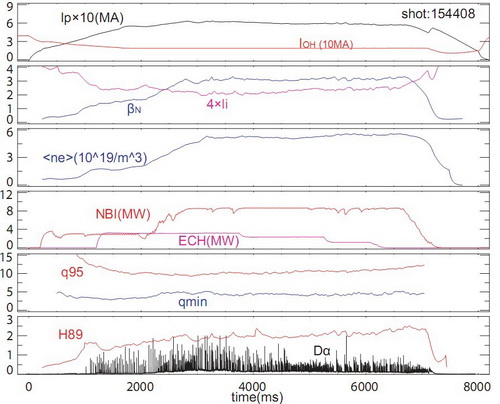 此次实验的主要目的是利用DIII-D的离轴加热与电流驱动能力(中性束和电子回旋)模拟EAST的实验条件,实现高比压(归一化磁比压ßN = 3-4)、高自举电流份额(60%-85%)的完全非感应电流高约束等离子体,并利用DIII-D全面先进的物理诊断和分析工具进一步加深对相关物理问题的理解,为EAST实现具有高参数的完全稳态等离子体探索出一种先进的运行模式。