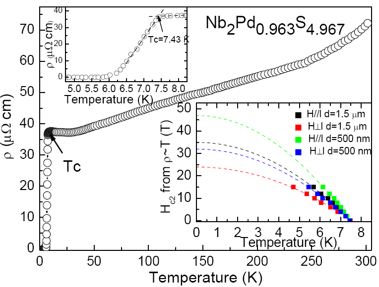 该研究小组通过在原始化学配比中调节Nb,Pd,和S的不同组分,并适当在高温反应中调节反应温度和降温的方式,获得了大量具有相似纤维状形貌的Nb2PdxS5-y (0.6<x<1;0<y<0.61)样品。非常有意思的是,在其高的Pd位和S位缺陷浓度下,样品仍具有良好的超导转变,表明体系的超导电性非常强壮。